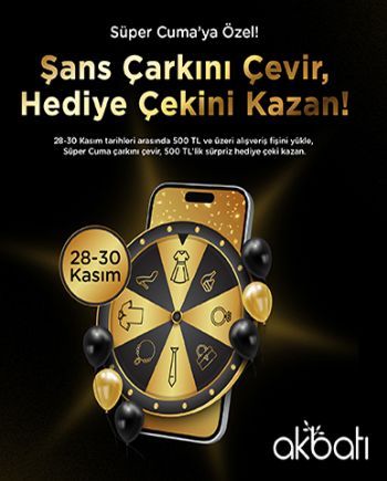 28-30 Kasım Tarihleri arasında 500 TL ve üzeri alışveriş fişini yükle, Süper Cuma çarkını çevir, 500 TL lik Sürpriz hediye çeki kazan.
